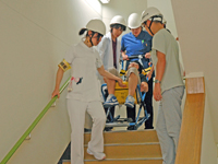 病棟からの避難誘導訓練では、階段避難車であるイーバックチェアで実際に階段を下り、病院玄関では様々な症状を訴える患者役の学生や病院ボランティアがストレッチャーなどで運ばれ、治療の優先順位をつけるトリアージ訓練を本番さながらに行いました。