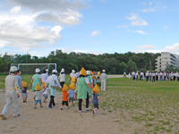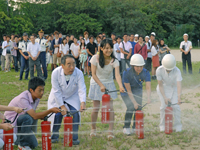 最後に、各部署からの避難経路を確認しながら避難訓練を実施し、避難場所となっている大学グラウンドで、消防署員指導による消火器の操作訓練を行い、消火器の仕組みや使い方、使用上の注意等について理解を深めました。