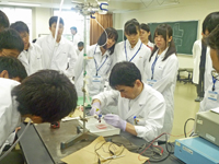 ちょうど、医学科第4学年の山本大雅君、西野裕香さん、野土希実さん達が自主研修として生理学講座(細胞機能生理学部門)で学習していたことから、実習に積極的に参加して、生徒の質問にも答えながら実習の補助を行いました。