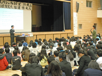 その一環として、平成25年12月11日、本学生理学講座(細胞機能生理学部門) 松浦 博教授が、「心臓のしくみとはたらき」というテーマで、草津市立老上小・中学校の250名の生徒・児童の皆さんを対象に授業を行いました。