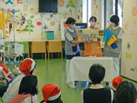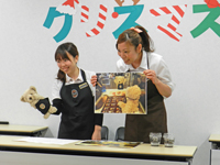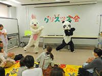 クリスマス会では、併設している院内学級の子どもさん達のハンドベルによるクリスマスソングの演奏、看護学生による布絵本「おおかみと7ひきのこやぎ」、先生達によるウサギとパンダの着ぐるみを着てのダンス、タリーズコーヒーの職員さんによる紙芝居などを楽しみました。