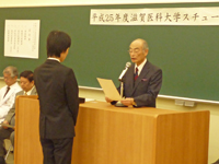当日は、学長、医学科長からの挨拶に引き続き、学生代表の 横江 真弥君に認定証書が交付され、同じく学生代表の 沖 達也君から決意表明がなされました。