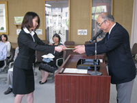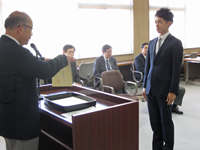 授与式では、塩田学長から奨学生一人ひとりに奨学生採用通知書が手渡された後、お祝いの言葉とともに「この奨学金には多くの方々の期待が込められています。皆さんが将来活躍するための励みにして頑張って下さい。」との激励がありました。