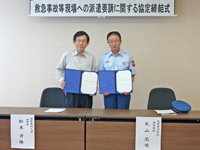 7月31日(木)、本学附属病院において、「救急事故等現場への職員派遣に関する協定」締結式を、丸山 忠司 大津市消防局長、松末 吉隆 本学附属病院長の双方立会いのもと、執り行いました。