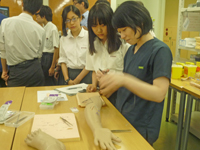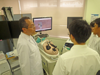 また、スキルズラボでは、西田センター長、研修医の平山医師から臨床実習で使用する高価な医療手技訓練用のシミュレーターについて説明と指導があり、実際にシミュレーターを体験していました。