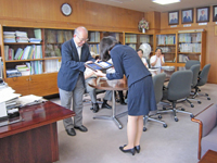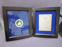表彰伝達式は平成26年8月7日(木)に学長室にて行われ、役員立会いの下、塩田学長から記念の盾が手渡されました。