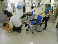 さらに、避難訓練では、病棟の模擬患者を階段避難車であるイーバックチェアにより実際に階段を下りて避難場所へ搬送したが、今回初めて、ボランティア登録した学生が患者搬送補助を行いました。