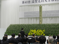 10月23日(木)午前10時から本学体育館において、ご遺族、ご来賓、しゃくなげ会会員様及び教職員・学生合わせて580名が参列し、厳かに第40回滋賀医科大学解剖体慰霊式を執り行いました。このたびは、系統解剖42霊、病理解剖32霊、法医解剖97霊、計171霊を新たにお祀りし、御霊(みたま)のご冥福をお祈りしました。