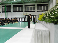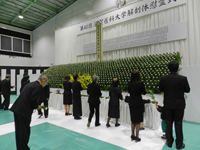 慰霊式は、最初に参列者全員で御霊に黙祷を捧げ、諸霊芳名拝誦、塩田学長による慰霊の辞、学生代表の慰霊の詞、高橋しゃくなげ会理事長の献辞の後、出席者全員による献花が行われました。