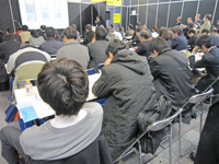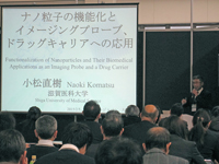 また、生命科学講座(化学)の小松准教授が、「ナノ粒子の機能化とイメージングプローブ、ドラッグキャリアへの応用」をテーマにプレゼンテーションを行いました。100名以上(椅子席45、立ち見多数)の方々が熱心に聴衆され、質問も活発に行われ、セミナー終了後も小松准教授と意見交換されていた研究者が多数おられ盛況のうちに終了しました。