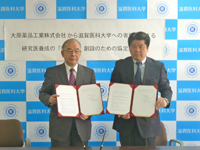 平成27年2月10日(火)、滋賀医科大学と大原薬品工業株式会社は、大原薬品工業株式会社からの寄附金により研究医養成の「奨学金」を創設し、研究医を目指す学生を支援することを目的として協定を締結しました。