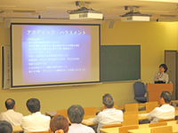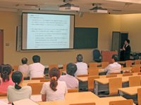 研修会では、例年どおり、堀池副学長から「本学の教育理念について」、学部教育部門長の松浦教授から「講義、出欠確認、レポート、筆記試験、成績評価」について、教育方法改善部門長の扇田教授から「授業評価システム」について、保健管理センターの小川講師から「ハラスメント」についての講演が行われ、加えて、平成26年度ベストティーチャー賞受賞教員の臨床看護学講座 立岡教授から「ひと手間かけた助産学講義 〜助産の魅力を伝えるために〜」と題した講演がありました。