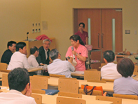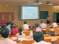 立岡教授の講演では、実際の授業で行っている演習の実演により、普段の講義等での工夫や手作りの教材などについて紹介があり、参加者は、熱心に、また興味深く聴講していました。