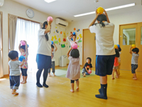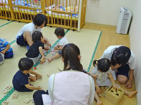 学内保育所「あゆっこ」では、4名の中学生が、0〜1歳児、2〜3歳児クラスに分かれて1日の保育業務を体験し、また外部講師によるリトミックや体操教室にも参加して園児たちとふれあいました。