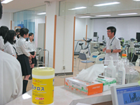 当日は、生化学・分子生物学講座 上山准教授の講義に引き続き、金崎医師臨床教育センター副センター長、高見副看護部長の引率により、3班に分かれて病院見学に向かいました。