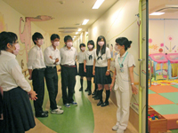 さらに5A病棟では堀尾看護師長から小児科病棟での看護業務について説明を受け、壁に描かれた「瀬田の森」を興味深く見学していました。