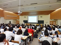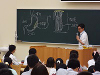 塩田学長の挨拶に続き、大学の概要を映像で紹介し、入試情報の説明を行いました。その後、本学が求める学生像などについて「入学者に望むこと」と題し竹内教授(小児科学講座)から説明を行いました。続く模擬講義では、臨床検査医学講座の九嶋教授による「胃がんをとりまく人々」をテーマに、大学での授業を短時間ながら実際に体験していただきました。