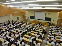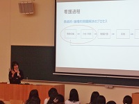 午前中は、塩田学長の挨拶に続き、大学の概要を映像で紹介、入試情報の説明を行った後、桑田看護学科長から本学の看護教育の特色などについて説明を行いました。その後、公衆衛生看護学講座の川畑教授による「公衆衛生と保健師」と題した模擬講義が行われ、大学での授業を短時間ながら実際に体験していただきました。