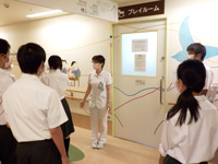引き続き、梅田医師臨床教育センター副センター長、加賀副看護部長の引率で2班に分かれて病院見学に向かいました。
