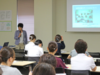 今回は講師に草津市訪問看護ステーションの新村 真喜子所長をお迎えし「訪問看護ステーション」について講演していただきました。参加者39名のアンケートには、「内容がわかりやすく、特に最後のVTRには感動し、やはり看護は良いなぁと感じました」との感想や「訪問看護の具体的なイメージが理解できて、ますます興味が持てて良かった」との嬉しい声もありました。