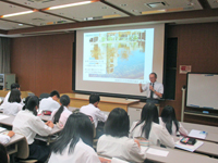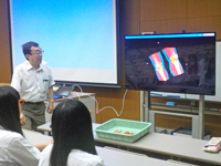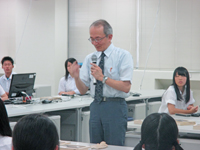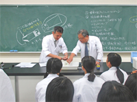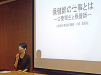 一方、看護学コースでは、臨床看護学講座(老年)の畑野 相子教授、遠藤 賢子助手から「『食べること』をささえる看護」と題し、また、基礎看護学講座(形態・生理)の森川 茂廣教授から「コンピュータを活用した形態学」と題し、様々な教材を準備して授業が行われました。最後に公衆衛生看護学講座の川畑 摩紀枝教授から「保健師の仕事とは」と題して授業が行われました。