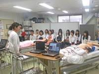 その後、看護学コースの生徒は、看護臨床教育センターを見学し、センターの多川 晴美准教授や平岡 葉子看護師から若手看護師の教育に使用しているシミュレータについて説明を受けました。