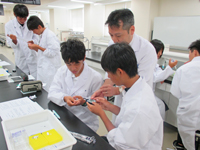 医学コースでは、生化学・分子生物学講座(再生・修復医学)の小島 秀人教授による実験が行われ、寺島 智也准教授の他に2名の先生も指導に加わり、糖負荷試験を行って、生徒自ら自身の血液を採取し血糖値とインスリン値を調べました。