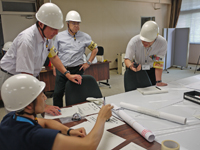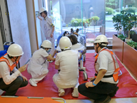 最後に、消防署員の指導による水消火器の操作訓練と屋内消火栓の放水訓練を行い、消火器や屋内消火栓の仕組みや使い方、使用上の注意等について理解を深めました。また、今年度は、地震体験車両に出向していただき、過去の大地震を体験することで防災意識を更に高めることができました。