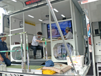 災害対策本部・病院本部では、各部署から集められた情報からトラブル等への対応指示とフォローを行いました。また、学外関連機関等への緊急時の連絡通報訓練として、衛星電話により滋賀県や滋賀県医師会に被災状況及び病院の受入体制などの連絡、浜松医科大学には災害時における大学病院間の相互支援に関する協定に基づく応援要請を行いました。病院玄関では様々な症状を訴える患者役の学生や病院ボランティアがストレッチャーなどで運ばれ、治療の優先順位をつけるトリアージ訓練を本番さながらに行いました。