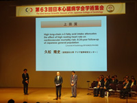 本年度の最優秀論文「上田賞」に久松特任助教の「High long-chain n-3 fatty acid intake attenuates the effect of high resting heart rate on cardiovascular mortality risk: A 24-year follow-up of Japanese general population. (Journal of Cardiology. 2014;64(3):218-24.)」が選ばれました。