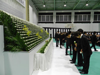 慰霊式は、最初に参列者全員で御霊に黙祷を捧げ、諸霊芳名拝誦、塩田学長による慰霊の辞、学生代表の慰霊の詞、高橋しゃくなげ会理事長の献辞の後、参列者全員が献花を行いました。