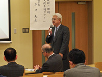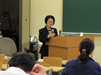 講演では、日本の経済成長と女性の就業率の相関関係をOECD各国のデータと比較し、30歳代を中心とする女性労働力率の一時的な低下(M字カーブ)等の日本の現状が紹介されました。女性研究者(女性教員)の出産・育児・介護等のライフイベントと研究継続の関係についても、本学及び他大学医学部のデータを基に解説され、研究者の研究業績は個人に帰属するためワークシェアリングが難しいことなどを考慮すると、女性研究者のキャリア維持・向上を支援するためには研究補助者の配置が最も有効であると述べられました。