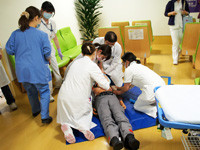 今回は、実際に即した訓練となるよう訓練日時のみ周知し、場所は明らかにしないで行いました。訓練放送により、コードブルーが検査部で発生したことを伝えると、検査部受付前に看護師、検査技師等メディカルスタッフが速やかに集合し、慌てることなく、適切な対応ができました。今回は、場所を正確に伝えることの重要性を再認識する訓練となりました。ご協力ありがとうございました。
