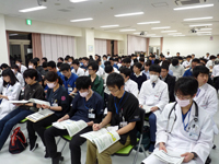 当日は、研修医(2年目34名、1年目29名)と医学科生(6年5名、5年生9名、4年生2名)計79名の参加があり、本学医学部附属病院松末病院長の挨拶に続き、本学臨床教育講座伊藤教授より、専門研修プログラム全体説明として、「新たな専門医制度の概要」と「滋賀医科大学における新たな専門研修プログラムの概要」について説明が行われました。