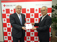 5月20日までに300万円の支援が寄せられ、5月24日、竹田理事(総務・財務・施設等担当)から日本赤十字社滋賀県支部 深尾事務局長に義援金目録が贈呈されました。