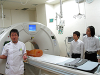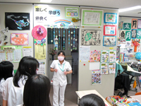 一方で、木田診療放射線技師長、牛尾主任診療放射線技師からCT装置や画像について、5A病棟では堀尾看護師長から小児科病棟での看護業務についてそれぞれ説明を受け、院内学級や壁に描かれた「瀬田の森」を興味深く見学していました。