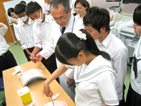 また、スキルズラボでは西田医師臨床教育センター長から臨床実習で使用するシミュレータについて説明を受け、何人かは腕の切創の縫合や内視鏡のシミュレータに挑戦していました。