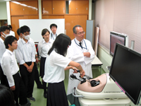 当日は、外科学講座(消化器・乳腺・一般外科) 仲准教授の講義に引き続き、医師臨床教育センター副センター長の小牧特任講師、高見・加賀副看護部長の引率により、3班に分かれて病院見学に向かいました。