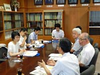 続いて、小松局長は、塩田浩平学長や小笠原一誠理事、竹田幸博理事らとともに意見交換を行い、同センターを取り巻く現状や課題そしてカニクイザルを用いた共同利用・共同研究拠点化構想などについて説明を受けられました。