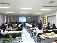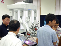 泌尿器科学講座 河内教授の講演に続き、100名を超える参加者が実際に機械を動かしたり、シミュレータでの操作を体験したりしました。ダビンチの開発メーカー社員から、使い方について説明を受けた後、カメラを覗きながら操縦装置でアームを動かし、直径5ミリの輪ゴムを、臓器に見立てた突起物に移動させていました。