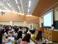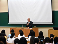 午前中は、塩田学長の挨拶に続き、本学の看護教育の特色などについて臨床看護学講座の宮松教授から説明を行いました。その後、入試情報の説明を行い、続く模擬講義では、公衆衛生看護学講座の伊藤教授による「健康について考える」をテーマに、大学での授業を短時間ながら実際に体験していただきました。