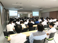 小笠原理事の挨拶の後、講師:東京大学医科学研究所公共政策研究分野 准教授 井上 悠輔氏により「利益相反管理・国会での「臨床研究法案」をめぐる議論の動向」について御講演いただき、125名が参加しました。