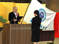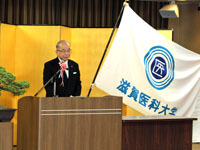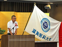 修了式には学内からは塩田学長、山田副学長をはじめとした5名が、学外からは滋賀県健康医療福祉部の角野次長ら7名が出席され、修了生7名を祝福しました。修了生に1人ずつ、学長から修了書が手渡され、その後塩田学長と角野次長から祝辞をいただきました。