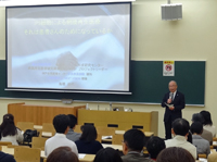 講演では、網膜のiPS細胞を用いた再生医療研究と臨床の現場等、具体的な例を挙げながら研究と臨床との関係について述べられました。研究で得られた成果を臨床で使用するだけにとどまらず、患者の社会活動の重要性にも言及され、現在取り組みを行っておられる様々な新プロジェクトについても説明がありました。