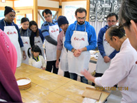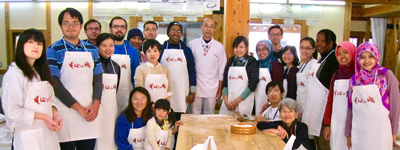 2日目は、午前中に中山道の妻籠宿を訪れました。参加者全員で本陣を見学した後、宿内を自由に散策し、見事に保存された古い宿場の景観に歴史の重みを感じました。その後、下伊那の道の駅信濃路下條に移動して、そば打ち体験を行いました。参加者一同、指導員の手ほどきを受けながら、粉まみれになって信州そばづくりを体験し、日本食への理解を深めました。